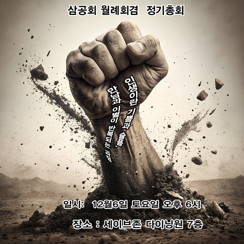 삼공회 월례회겸 정기총회 합니다 김작지30회 0 307 11.19 08:35 삼공회 월례회겸 정기총회 합니다 일시:12월6일 저녁6시 장소:세이브존 다이닝원 7층해운대 역(3번출구) 구남로29번길21주요안건26년도회장단구성 (운촌팀)문의총무